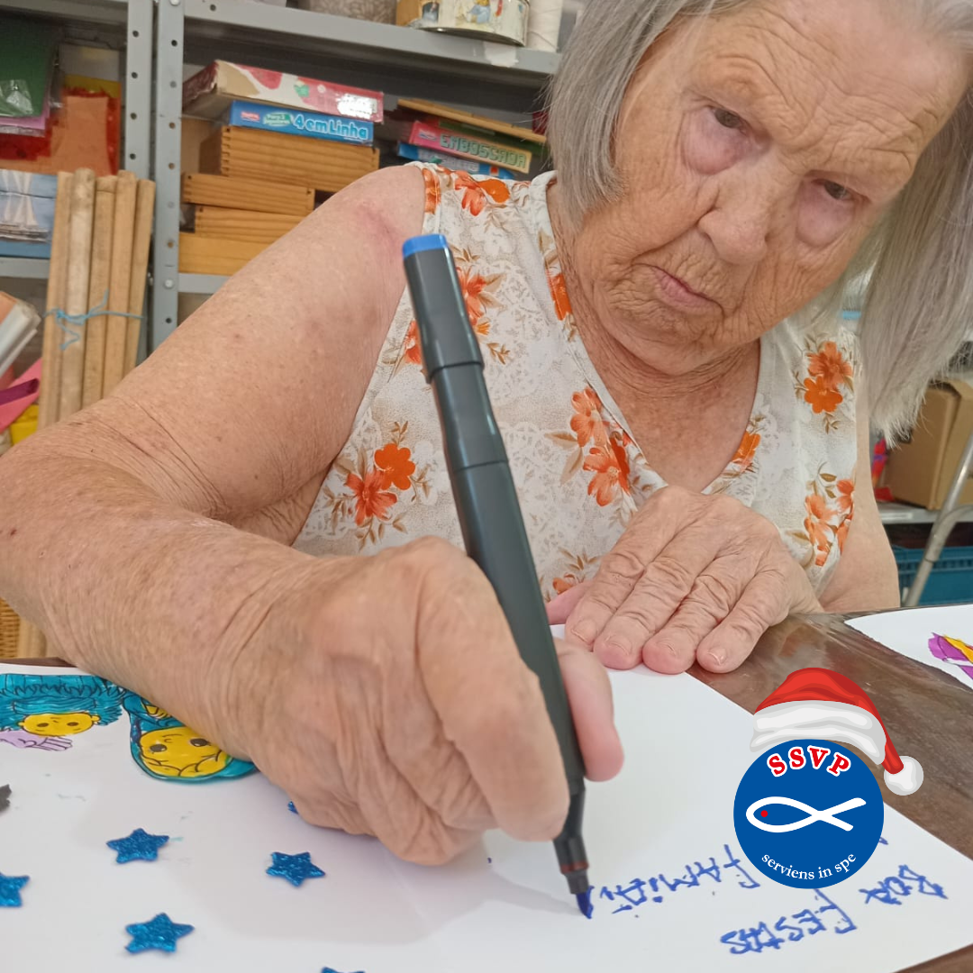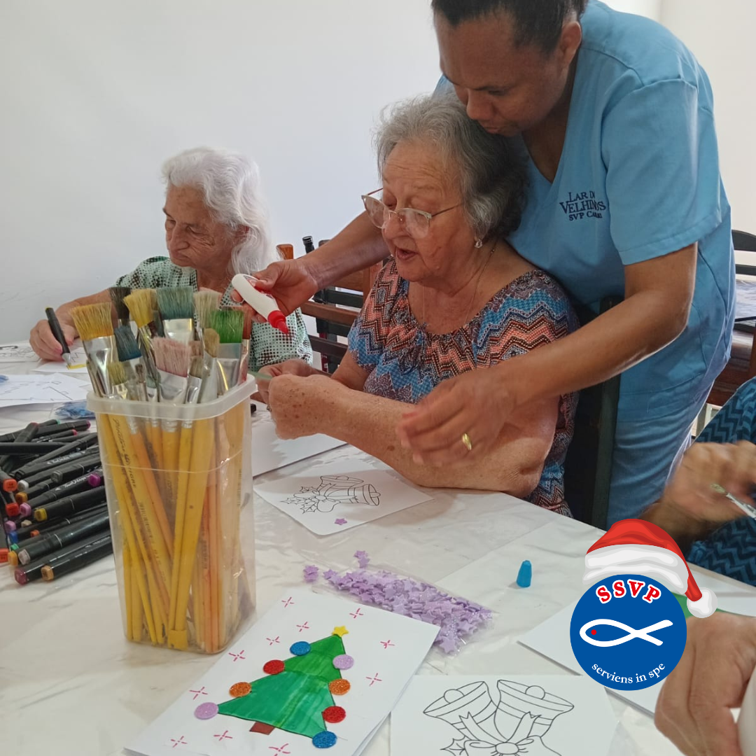 Na última quinta-feira, 11/12, vivemos um momento especial no Lar dos Velhinhos São Vicente de Paulo de Capivari. As crianças Maria Fernanda (12 anos) e os irmãos Vitor e Vitória (11 anos) promoveram uma Oficina de Cartões de Natal com nossos moradores.