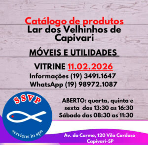 DOE E SEJA VOLUNTÁRIO CATÁLOGO DE PRODUTOS PRECISAMOS DE DOAÇÕES FUNCIONAMENTO: https://www.larvelhinhoscapivari.org.br/wp-content/uploads/2025/11/bazar-02.mp4 https://www.larvelhinhoscapivari.org.br/wp-content/uploads/2025/11/bazar-01.mp4 FORMAS DE PAGAMENTO Aceitamos PIX 46 368 429 0001 37 Aceitamos Cartão Débito. Aceitamos Cartão de Crédito – dividimos em até 6x HORÁRIO ABERTO quarta, quinta e sexta das 13:30 as 16:30 h e aos sábados das 08:30 as 11:30 Local: Av. do Carmo, 120 Vila Cardoso, Capivari-SP Informações (19) 3491.1647 WhatsApp (19) 98972.1087 Aceitamos cartão de Crédito, Débito, PIX CNPJ 46 368 429 0001 37 APROVEITE! COMPARTILHE!!