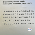 1. 🧠 Estímulo Cognitivo: Caça-palavras temático (saúde, mamografia, autoexame, força, cura), unindo diversão e aprendizado. (Fotos 8, 9, 10)
