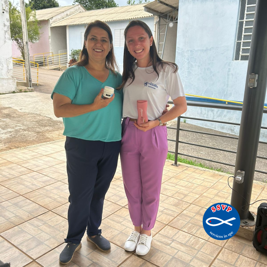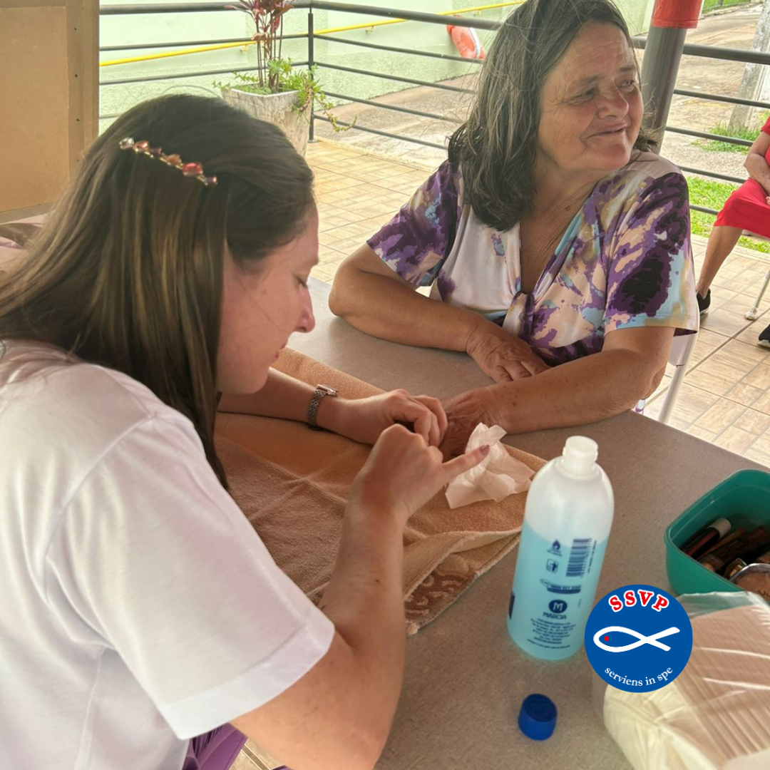 A equipe de saúde — fisioterapeuta e enfermeira — conduziu uma atividade dedicada ao autocuidado, com conversa orientada e atendimentos individuais, como hidratação da pele, cuidados com as unhas e com os cabelos.